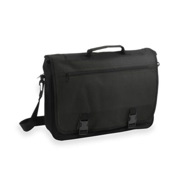 Documententas van 600D polyester, met klitteband klepsluiting in elegante zwarte kleur aan de voorkant. Met versterkte handvaten en schouderriem. Pennenvakken aan de binnenkant en smartphone-hoes van PVC.
