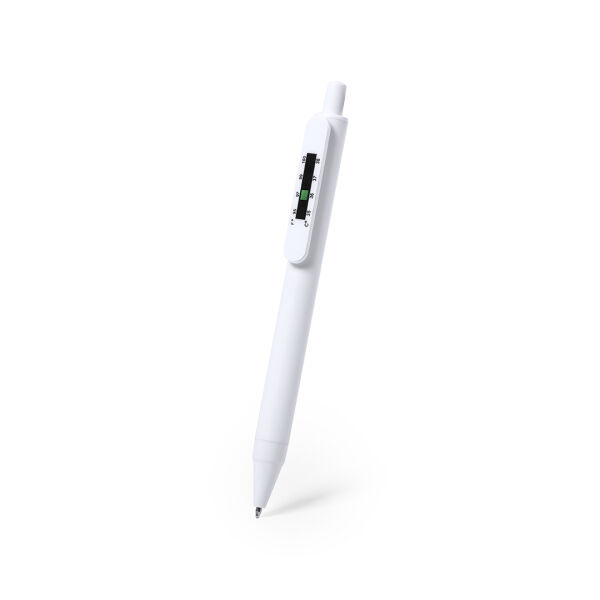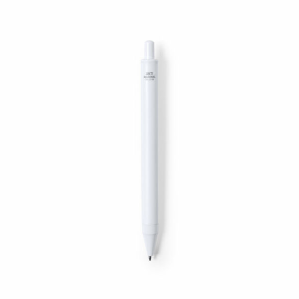 Anti-bacteriële balpen met push-up mechanisme en thermometer geïntegreerd in clip. Monochroom design, speciaal ontworpen voor tampondruk. In blauwe inkt en gepresenteerd in een individueel design zakje. Producten met antibacteriële behandelingen zijn in staat om de bacteriële belasting op de oppervlakken van de materialen drastisch te verminderen, dankzij de incorporatie van permanente statische microbiële agentia, met een hoge effectiviteit in het afremmen en voorkomen van bacteriële besmetting. Artikel volgens de norm ISO 22196, die de antibacteriële activiteit in plastic materialen en niet-poreuze oppervlakken bepaalt, waardoor we de doeltreffendheid van de microbiële remming die de additieven op de behandelde voorwerpen hebben, kunnen kennen door middel van een kwantitatieve evaluatie.